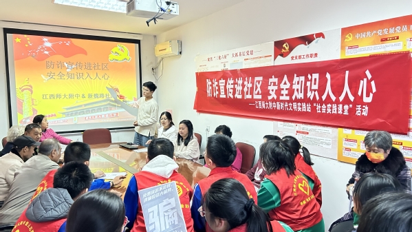 进一步筑牢老年人防诈骗安全屏障,帮助老年人提升防骗拒诈意识和能力,11月17日下午,江西师大附中团委汪俊杰老师带着紫云志愿者协会十余名学生志愿者来到新魏路社区新时代文明实践站,与社区工作者、社区爷爷奶奶一起,开展“校家社零距离”共建新时代文明实践站社会实践课堂活动。活动围绕“防诈宣传进社区 安全知识入人心”主题开展,结合常见的养老诈骗手段,向老年人宣传常见的养老诈骗及防范措施。